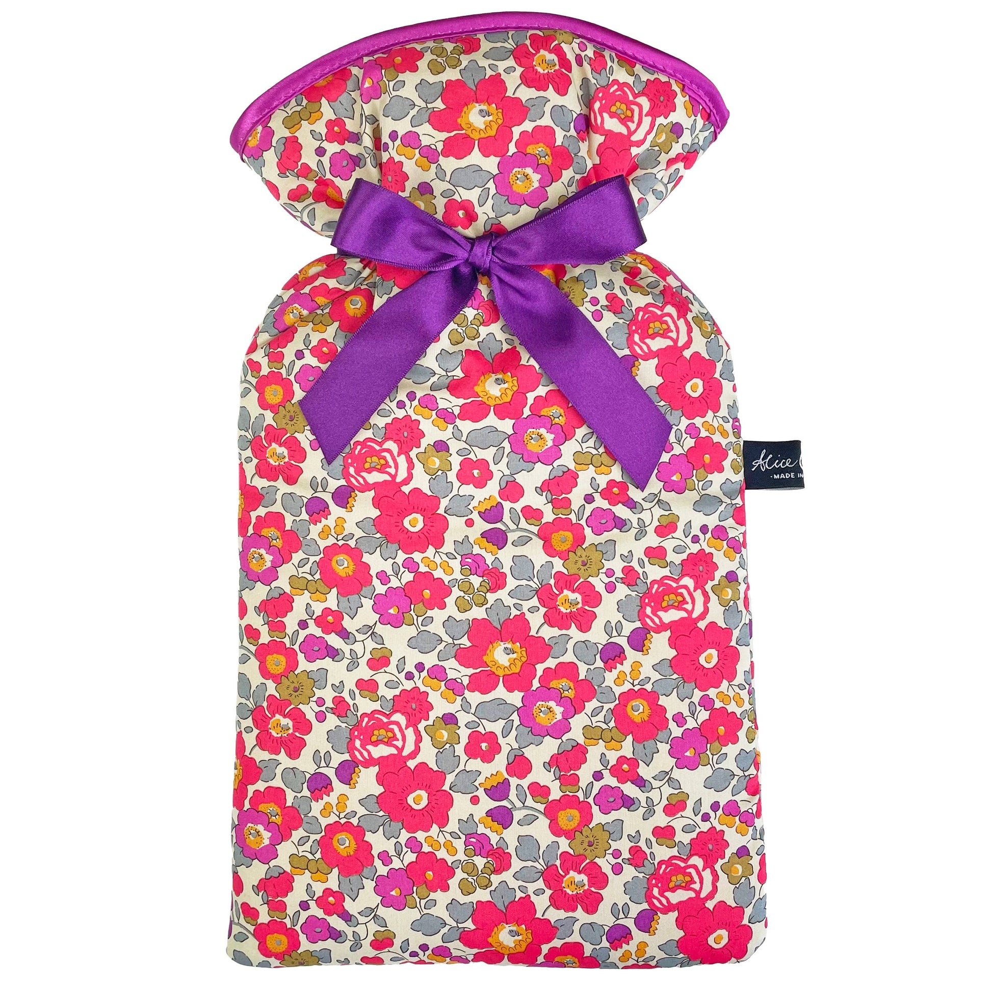 Hot water bottle cover with cotton drawstring ribbon and satin detail. Includes hot water bottle. Made from Liberty Tana Lawn Betsy fabric. Beautifully padded and soft to the touch. Perfect for gifting.