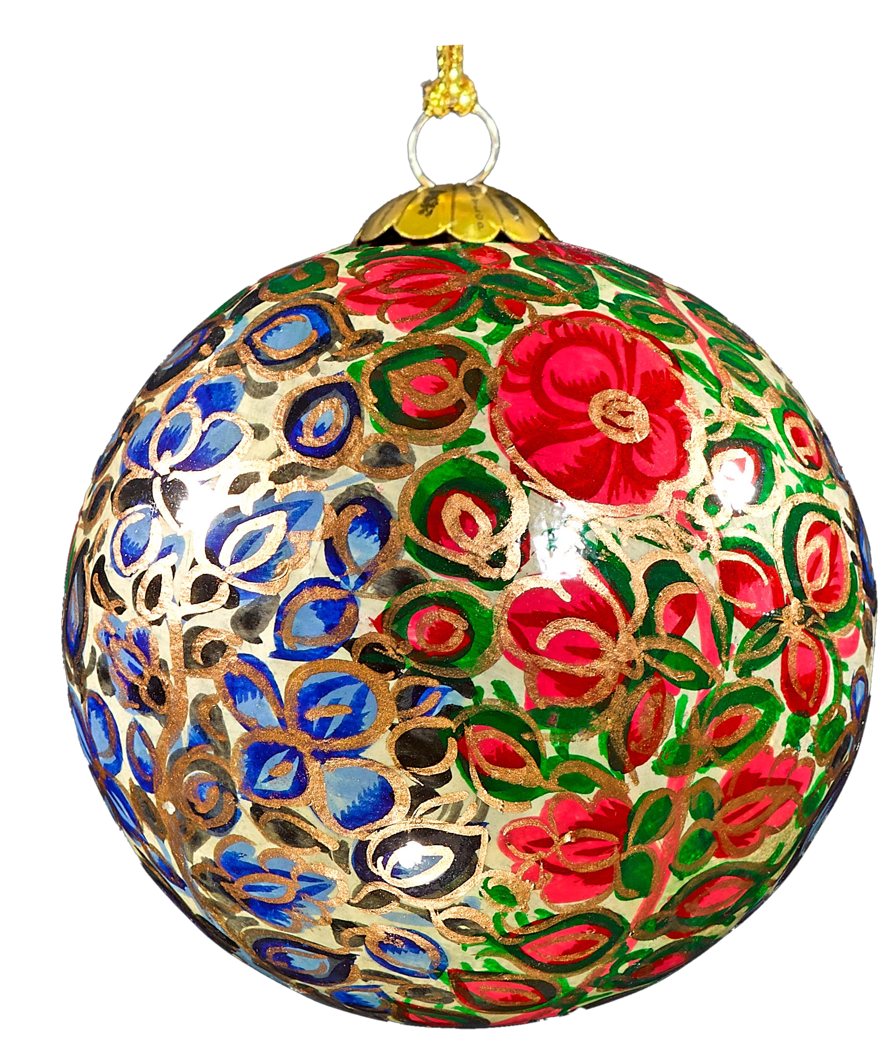This handmade and hand painted bauble is a true work of art, featuring a stunning design of red spring roses surrounded by beautiful red and blue floral designs. The bauble is expertly crafted by skilled artisans, and the attention to detail is evident in every stroke of paint. The vibrant red and blue colors of the floral designs provide a striking contrast to the delicate white of the roses, creating a truly mesmerizing visual effect. Hang this bauble on your tree or use it as a decorative piece in your home - either way, it's sure to bring a touch of beauty and cheer to your holiday season. The craftsmanship and attention to detail make this bauble a truly one-of-a-kind piece.