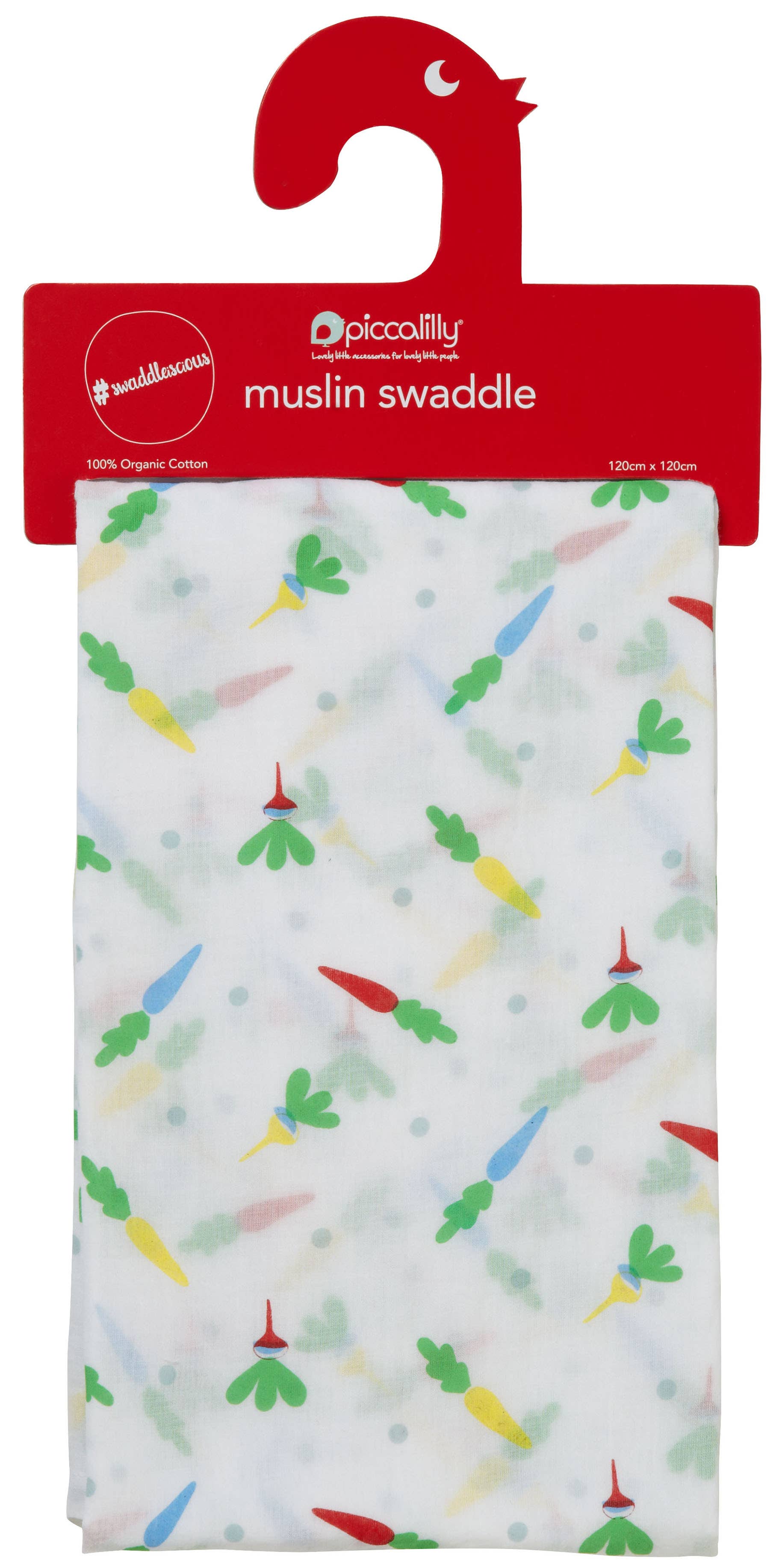 Our single layer lightweight organic cotton muslin swaddling blankets are the perfect fabric for swaddling a newborn baby. This muslin blanket for baby features a cute gender neutral carrot print. It's made from certified organic cotton, your only guarantee that it's been manufactured to GOTS (Global Organic Textile Standards) and it's free from harmful chemical pesticides and fertilisers. But what makes this lovely fabric so very special is its versatility and multitude of uses.