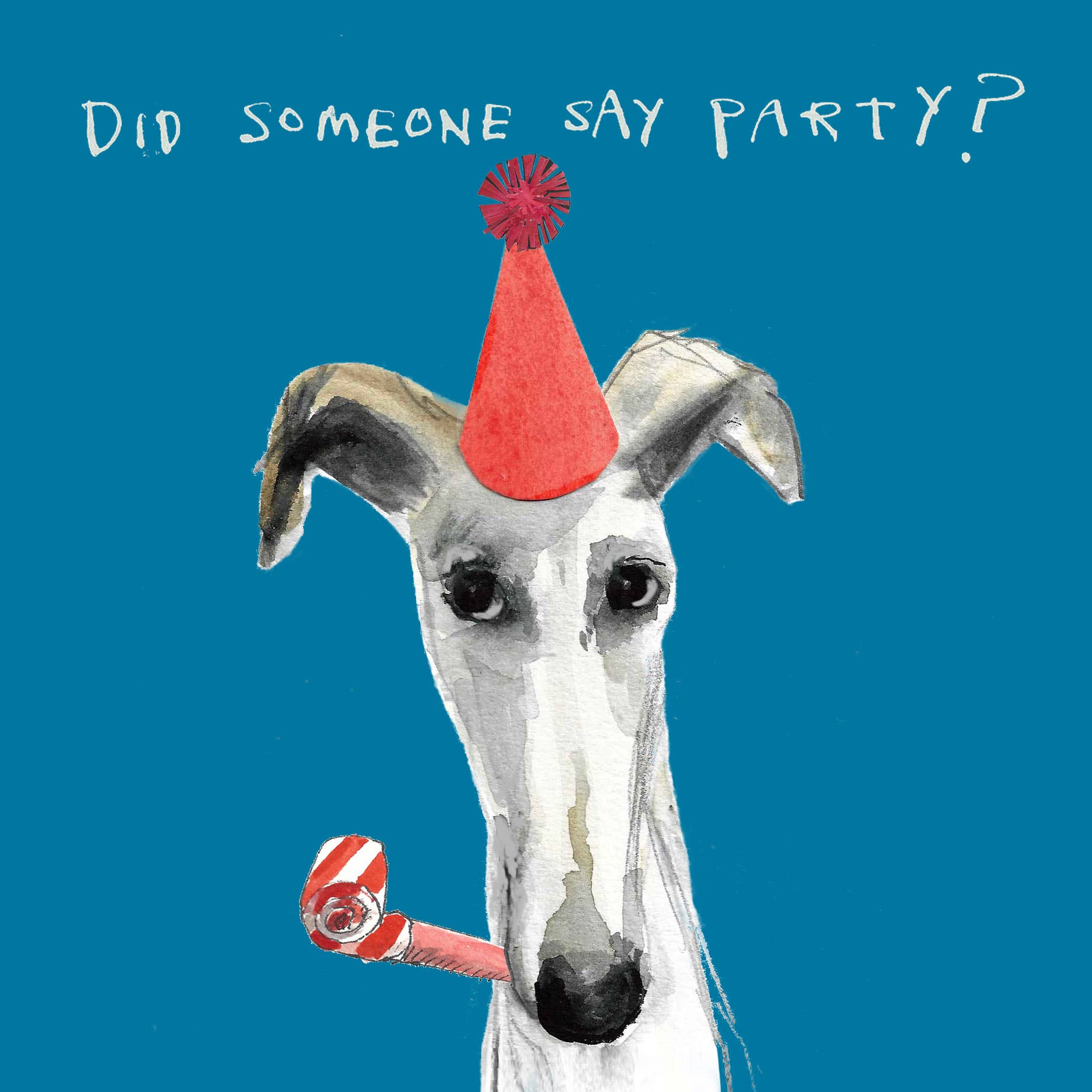 'Did Someone Say Party?' Greetings Card by Poet and Painter. Blank Inside 150mm x 150mm Printed on high quality, matt FSC rated card, selected for its beautiful print capacity. Supplied with FSC white envelope secured inside the card with a branded Eco-Clasp.