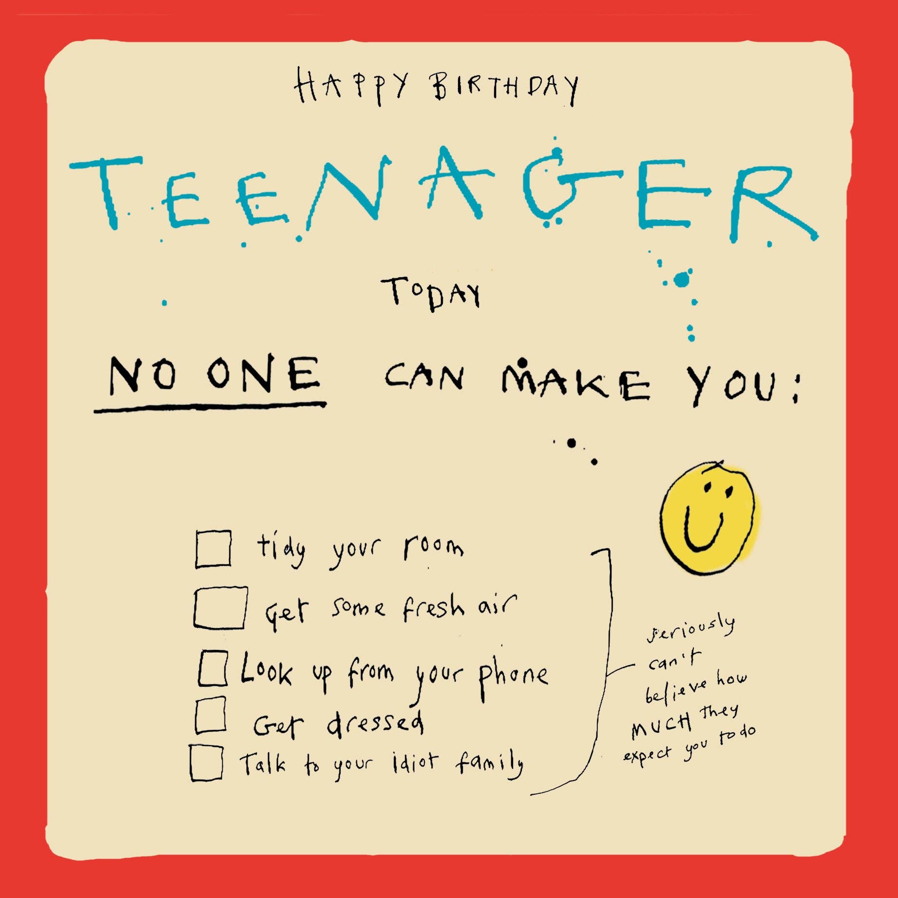 Teenage Birthday Checklist' Greetings Card by Poet and Painter. Blank Inside 150mm x 150mm Printed on high quality, matt FSC rated card, selected for its beautiful print capacity. Supplied with FSC white envelope secured inside the card with a branded Eco-Clasp.