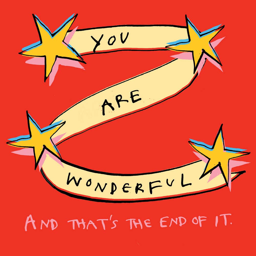 'You are Wonderful' 'Greetings Card by Poet and Painter. Blank Inside 150mm x 150mm Printed on high quality, matt FSC rated card, selected for its beautiful print capacity. Supplied with FSC white envelope secured inside the card with a branded Eco-Clasp.