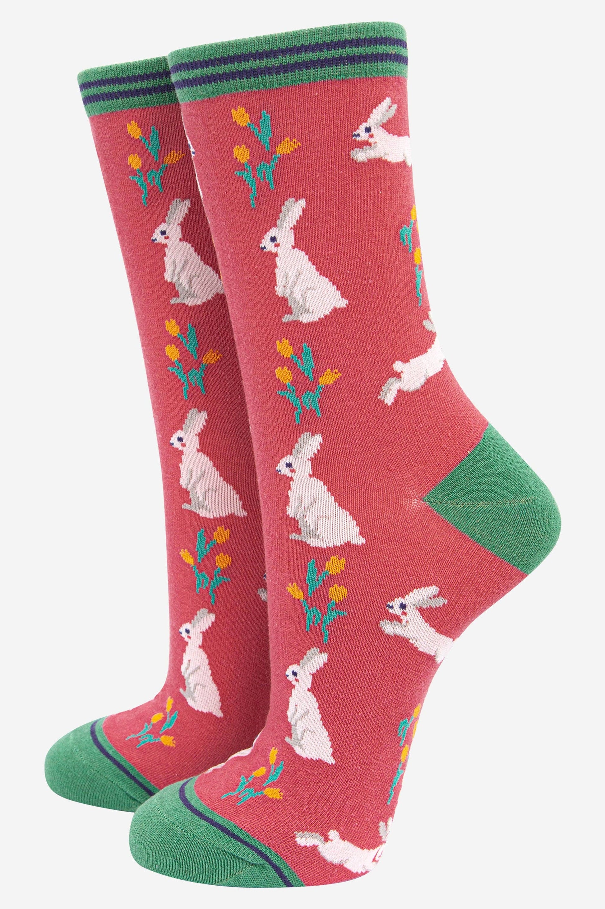Women's spring animal themed bamboo socks with a spring bunny rabbit and flowers and a striped detail cuff.